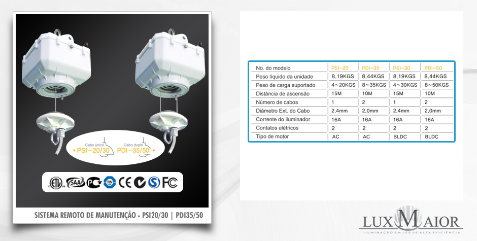 O Sistema remoto de manutenção – Tipo Tarefa Pesada da Lux Maior possui características excelentes de tamanho e peso, sendo que sua estrutura é especificamente adequada para lidar com cargas pesadas, sendo útil em diversos tipos de aplicação. É versátil, resistente e eficaz, sendo recomendado para uso em estabelecimentos residenciais, comerciais e industriais.