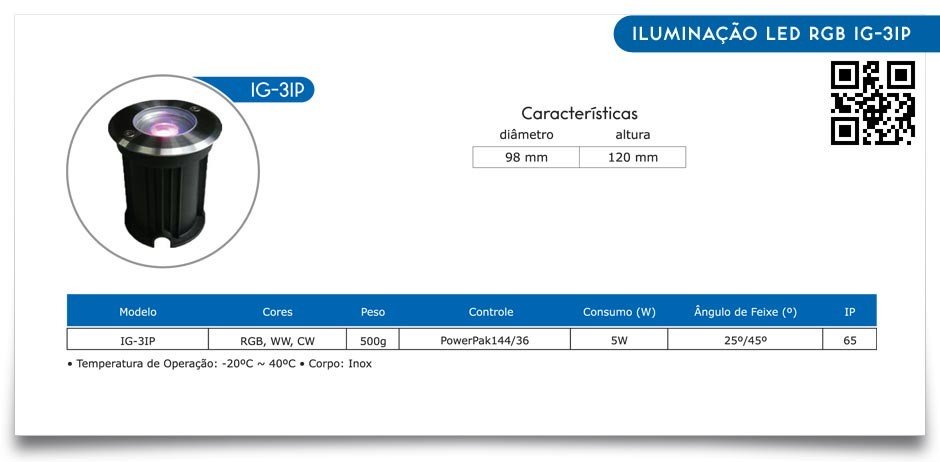 Para dar destaque no ambiente, objetos, detalhes da decoração e fachadas, você pode recorrer a iluminação LED RGB IG-3IP. Esse tipo de iluminação LED RGB IG-3IP permite acrescentar requinte ao ambiente ou chamar atenção para um objeto de decoração. A iluminação LED RGB IG-3IP também é útil para eventos e festas, decorando o ambiente como um todo ou em detalhes do palco e dos artistas ou produtos.