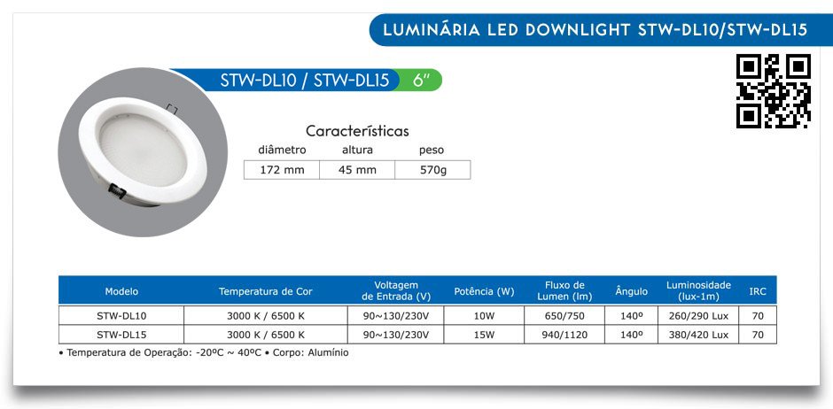 – A Luminária LED Downlight STW-DL10/STW-DL15 é recomendada para aplicações de baixa tensão;